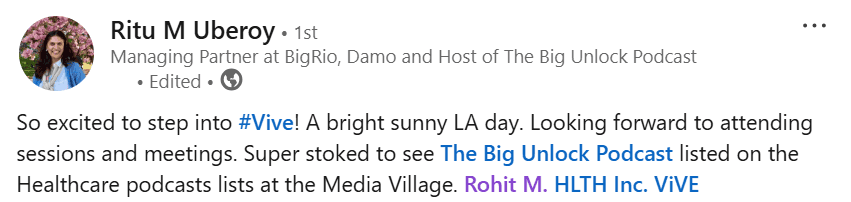 I’m also delighted to share that The Big Unlock Podcast continues to be featured in the ViVE Healthcare Podcast lists at the Media Village — a welcome acknowledgment of the meaningful dialogues we’ve been fostering with health system and industry leaders. Roaming the exhibit floor and seeing peers engage with the podcast’s themes — from workflow-first AI adoption to clinician-centric innovation — reminds me why we started this journey in the first place.
